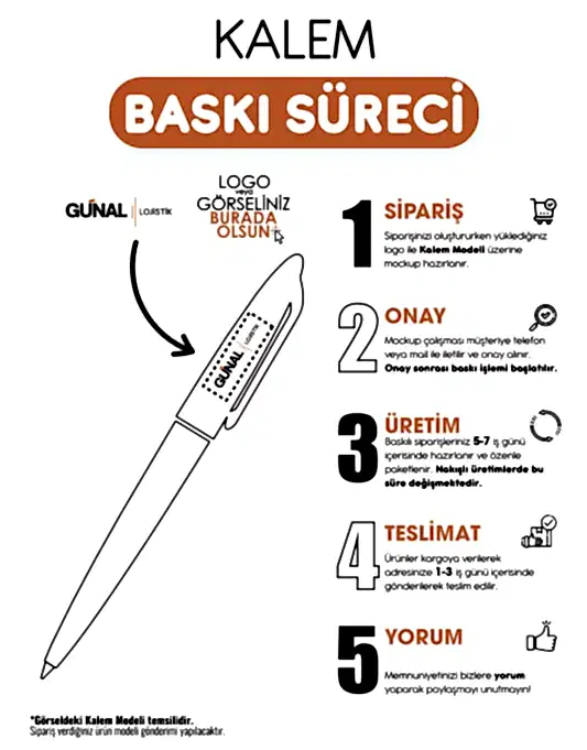 Logo baskılı ürünleri üretim süresi genellikle 4-5 iş günüdür. Kargo süresi bulunduğunuz konuma göre değişiklik gösterebilir. Siparişiniz kargoya verildiğinde size bir takip numarası gönderilecektir.