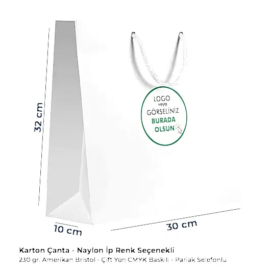 30×32×10 cm dikey karton baskılı çantamız; mağaza paketlemeleri, kurumsal etkinlikler, fuar promosyonları ve butik alışverişler için özel olarak hazırlanan, yüksek dayanımlı ve kaliteli bir taşıma çözümüdür. Tüm karton çantalar müşteriye özel üretildiği için dilediğiniz renk, tasarım ve ölçüde üretim yapılabilir. Sitemizde 20’ye yakın farklı ölçü mevcuttur; ihtiyacınıza uygun ölçüyü seçip sipariş verebilir, baskı dosyanızı kolayca yükleyebilirsiniz.